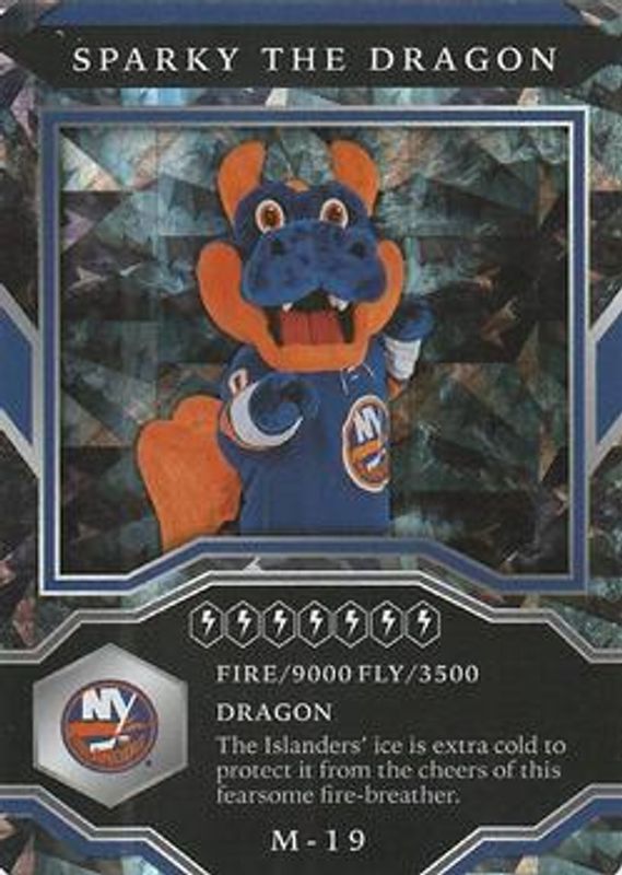 The Sparky The Dragon 2021 Upper Deck MVP #M-19 Mascots Gaming Sparkle card is 1 of 6 Sparky The Dragon's card variations in the 2021 Upper Deck MVP set being tracked by Sports Card Investor, including Mascots Gaming, Mascot Gaming - Printing Plates Black /1, Mascot Gaming - Printing Plates Cyan /1, Mascot Gaming - Printing Plates Magenta /1, and Mascot Gaming - Printing Plates Yellow /1.