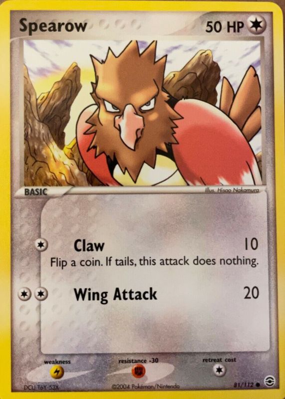 The Spearow 2004 EX: FireRed & LeafGreen #081/112 Base card in Raw TCG (Near Mint) condition has not changed in price in the last 30 days and was last sold for $2.62 .