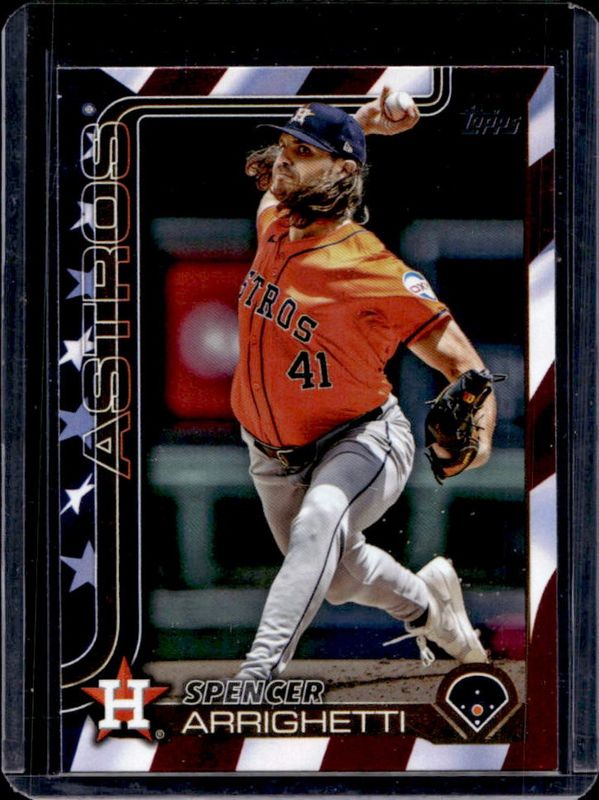 The Spencer Arrighetti 2025 Topps #522 Independence Day /76 card is 1 of 56 Spencer Arrighetti's card variations in the 2025 Topps set being tracked by Sports Card Investor, including Base, Aqua Holo Foil, Diamante Foil, Holo Foil, and Pink Diamante Foil.