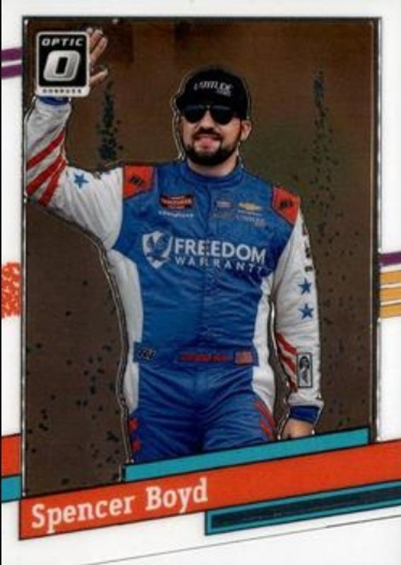 The Spencer Boyd 2024 Donruss NASCAR #122 Optic card is 1 of 34 Spencer Boyd's card variations in the 2024 Donruss NASCAR set being tracked by Sports Card Investor, including Base, Optic Black Pandora, Optic Blue Velocity, Optic Holo, and Optic Orange Velocity.