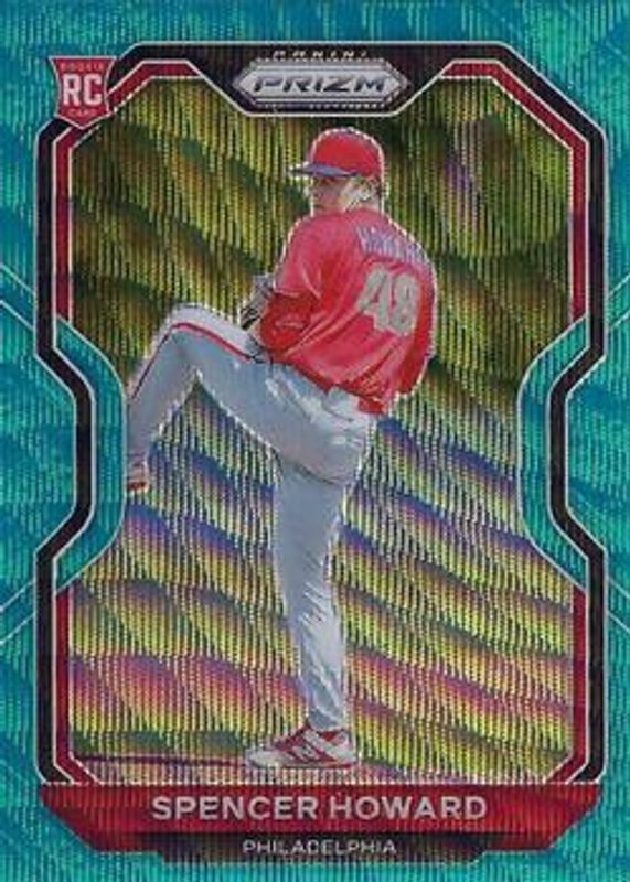 The Spencer Howard 2021 Prizm #66 Teal Wave Rookie card is 1 of 69 Spencer Howard's card variations in the 2021 Prizm set being tracked by Sports Card Investor, including Base, Blue, Blue Velocity, Carolina Blue, and Cosmic Haze.