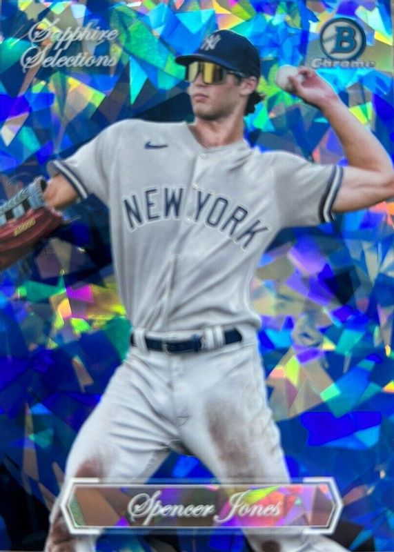 This card is 1 of 16 Spencer Jones' card variations in the 2023 Bowman Chrome Sapphire Edition set being tracked by Sports Card Investor, including Prospects, Prospects SP Variation (Leaning on Railing), Prospects - Aqua /99, Prospects - Orange /75, and Prospects - Yellow /50.