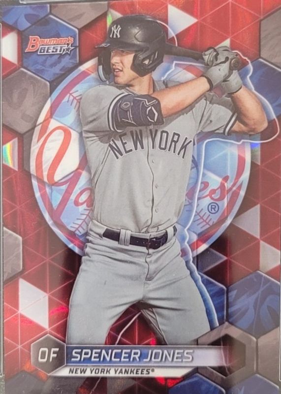 This card is 1 of 25 Spencer Jones' card variations in the 2023 Bowman's Best set being tracked by Sports Card Investor, including Top Prospects, Top Prospects - Refractor, Top Prospects - Wave Refractor, Top Prospects - Mini-Diamond Refractor /299, and Top Prospects - Purple Refractor /250.