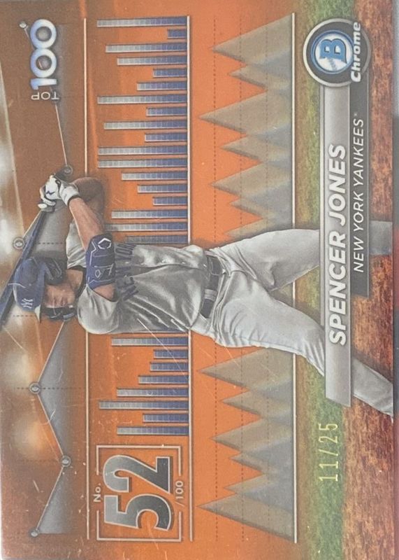 The Spencer Jones 2024 Bowman #BTP-52 Bowman Scouts' Top 100 - Orange Refractor /25 card in Raw condition has not changed in price in the last 30 days and was last sold for $11.11 .