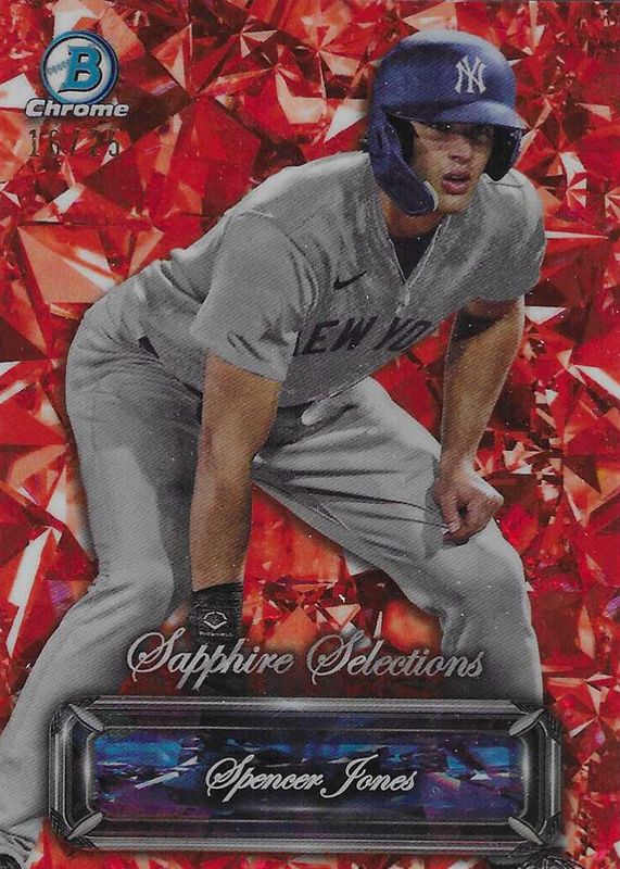 This card is 1 of 17 Spencer Jones' card variations in the 2024 Bowman Sapphire Edition set being tracked by Sports Card Investor, including Base, Green /99, Yellow /75, Gold /50, and Orange /25.