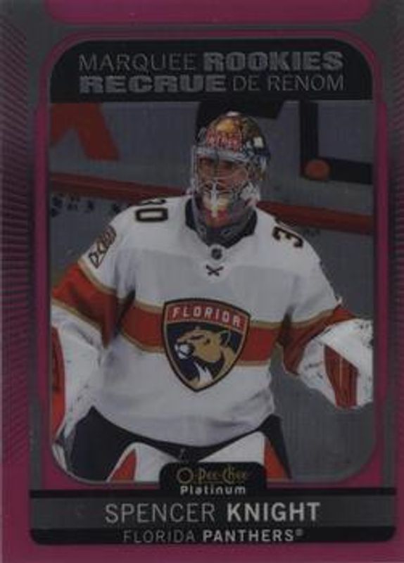The Spencer Knight 2021 O-Pee-Chee Platinum #204 Matte Pink Rookie card is 1 of 49 Spencer Knight's card variations in the 2021 O-Pee-Chee Platinum set being tracked by Sports Card Investor, including Base, Black Shield (Marquee Rookies), Blue Surge, Neon Yellow Surge, and Rainbow.
