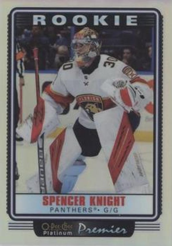 The Spencer Knight 2021 O-Pee-Chee Platinum #OP39 Premier Rookie card is 1 of 49 Spencer Knight's card variations in the 2021 O-Pee-Chee Platinum set being tracked by Sports Card Investor, including Base, Black Shield (Marquee Rookies), Blue Surge, Matte Pink, and Neon Yellow Surge.