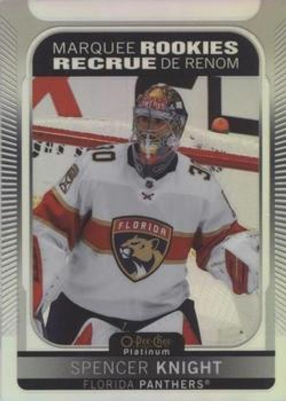 The Spencer Knight 2021 O-Pee-Chee Platinum #204 Rainbow Rookie card is 1 of 49 Spencer Knight's card variations in the 2021 O-Pee-Chee Platinum set being tracked by Sports Card Investor, including Base, Black Shield (Marquee Rookies), Blue Surge, Matte Pink, and Neon Yellow Surge.
