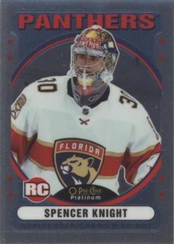 The Spencer Knight 2021 O-Pee-Chee Platinum #R-69 Retro Rookie card is 1 of 49 Spencer Knight's card variations in the 2021 O-Pee-Chee Platinum set being tracked by Sports Card Investor, including Base, Black Shield (Marquee Rookies), Blue Surge, Matte Pink, and Neon Yellow Surge.