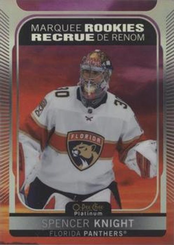 The Spencer Knight 2021 O-Pee-Chee Platinum #204 Sunset Rookie card is 1 of 49 Spencer Knight's card variations in the 2021 O-Pee-Chee Platinum set being tracked by Sports Card Investor, including Base, Black Shield (Marquee Rookies), Blue Surge, Matte Pink, and Neon Yellow Surge.