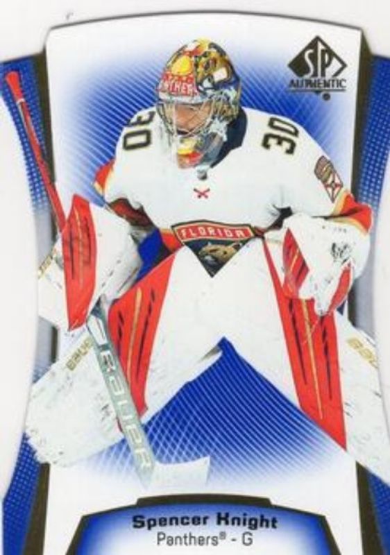 The Spencer Knight 2021 SP Authentic #DC-16 Die Cuts Blue Rookie card is 1 of 31 Spencer Knight's card variations in the 2021 SP Authentic set being tracked by Sports Card Investor, including Black Autographs, Limited Red, Limited Gold /99, Future Watch Inscribed /50, and Limited Black /1.