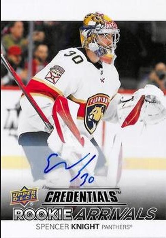 The Spencer Knight 2021 Upper Deck Credentials #RA-6 Rookie Arrivals Autographs card is 1 of 20 Spencer Knight's card variations in the 2021 Upper Deck Credentials set being tracked by Sports Card Investor, including Base /999, Yellow /249, Red /199, Orange /149, and Blue /99.
