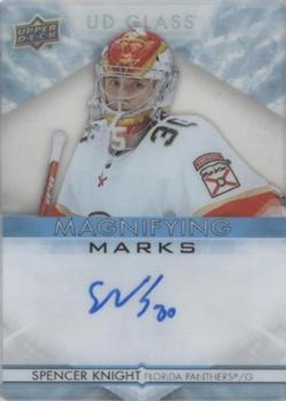 The Spencer Knight 2021 Upper Deck Ovation #MM-SK UD Glass Magnifying Marks Rookie card is 1 of 39 Spencer Knight's card variations in the 2021 Upper Deck Ovation set being tracked by Sports Card Investor, including Base, Checkerboard, Gold Circular Wonder, Gold Foil, and Silver Foil.
