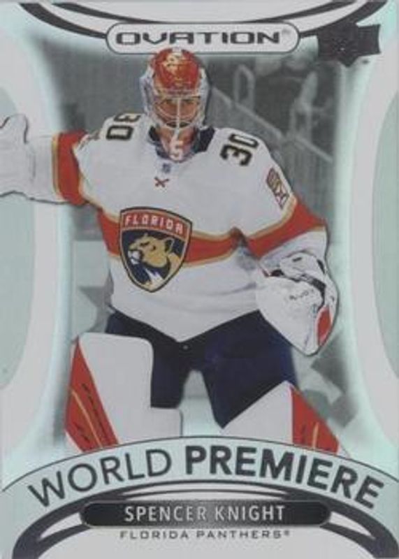 The Spencer Knight 2021 Upper Deck Ovation #WP-22 World Premiere Rookie card is 1 of 39 Spencer Knight's card variations in the 2021 Upper Deck Ovation set being tracked by Sports Card Investor, including Base, Checkerboard, Gold Circular Wonder, Gold Foil, and Silver Foil.