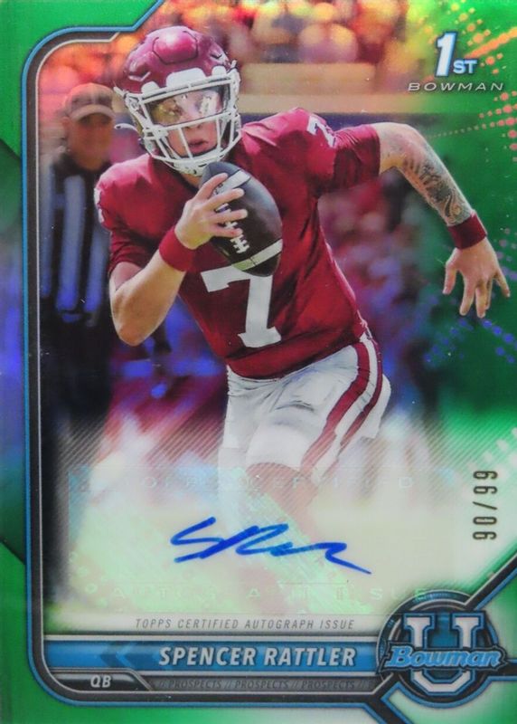 Best Prices Available For Sale of Spencer Rattler 2021 Bowman University #BCPA-SR Chrome Prospect Auto - Green Refractor /99 (1st)