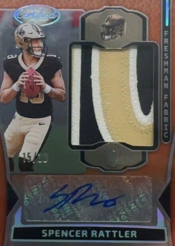 The Spencer Rattler 2024 Certified #FMS-SRR Freshman Fabric Signatures - Mirror Orange Etch /30 Rookie card in Raw condition has not changed in price in the last 30 days and was last sold for $47.55 .