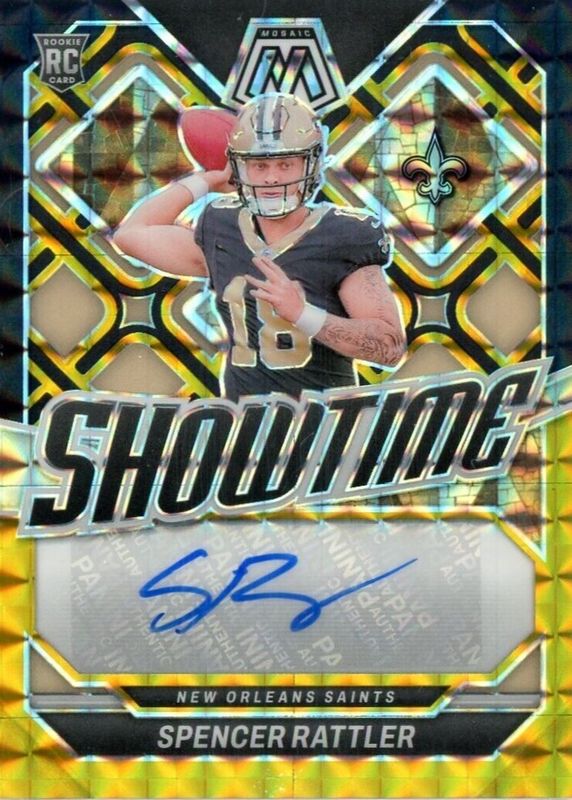 The Spencer Rattler 2024 Mosaic #SS-SRR Showtime Signatures - Choice Black Gold /8 Rookie card in Raw condition has not changed in price in the last 30 days and was last sold for $127.50 .