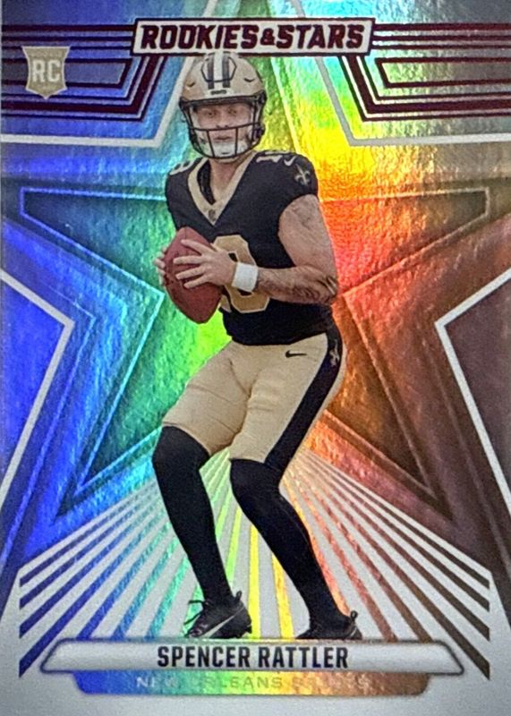 This card is 1 of 12 Spencer Rattler's card variations in the 2024 Rookies & Stars set being tracked by Sports Card Investor, including Base, Green, Red, Purple /299, and Orange /249.