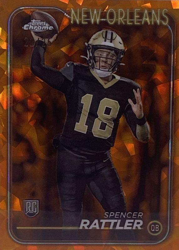 The Spencer Rattler 2024 Topps Chrome Sapphire Edition #213 Orange /25 Rookie card in Raw condition has not changed in price in the last 30 days and was last sold for $32.99 .