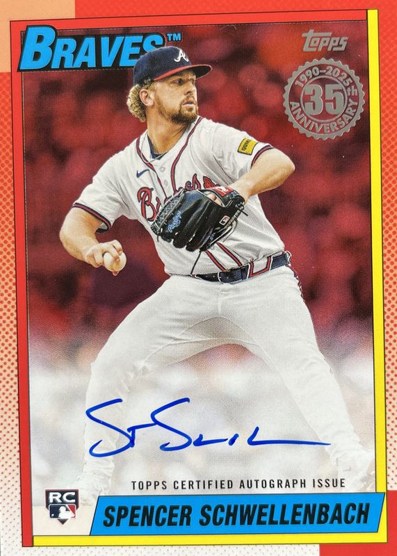 The Spencer Schwellenbach 2025 Topps #90A-SSC 1990 Topps Baseball Autographs - Red /5 Rookie card in Raw condition has not changed in price in the last 30 days and was last sold for $204.31 .