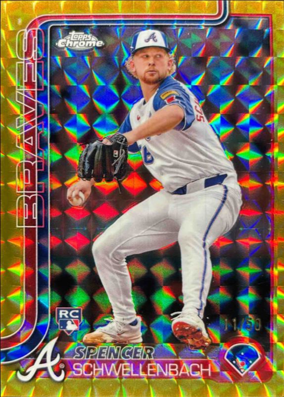 The Spencer Schwellenbach 2025 Topps Chrome #203 Gold Geometric Refractor /50 Rookie card is 1 of 73 Spencer Schwellenbach's card variations in the 2025 Topps Chrome set being tracked by Sports Card Investor, including Base, Geometric Refractor, Lightboard Logo Variation, Negative Refractor, and Prism Refractor.