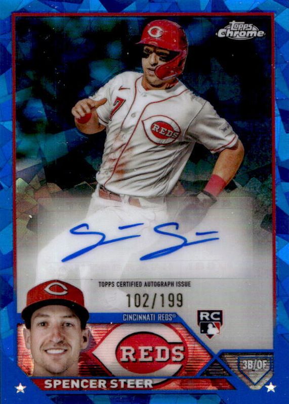 This card is 1 of 7 Spencer Steer's card variations in the 2023 Topps Chrome Update Sapphire Edition set being tracked by Sports Card Investor, including Autographs - Green /99, Autographs - Gold /50, Autographs - Orange /25, Autographs - Black /10, and Autographs - Red /5.
