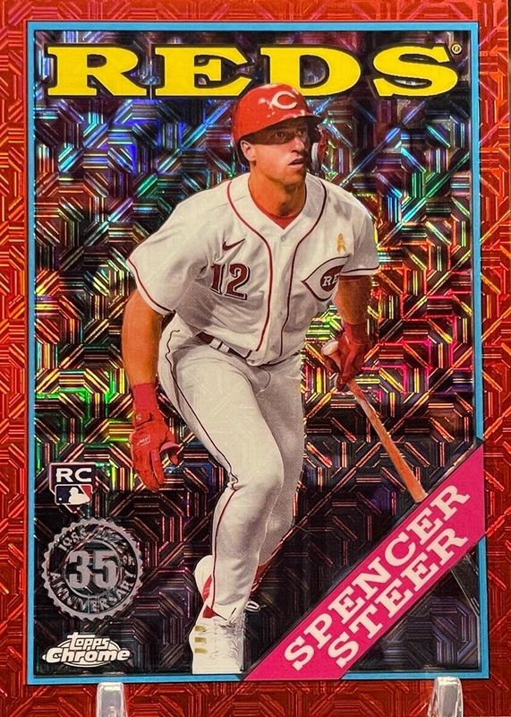 The Spencer Steer 2023 Topps Silver Pack #2T88C-82 1988 Chrome Promo - Red Refractor (Series 2) /5 Rookie card in Raw condition has not changed in price in the last 30 days and was last sold for $96.00 .