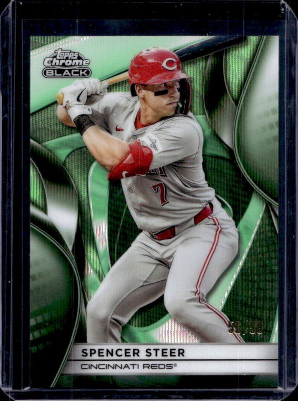 The Spencer Steer 2025 Topps Chrome Black #59 Green Wave Refractor /99 card is 1 of 17 Spencer Steer's card variations in the 2025 Topps Chrome Black set being tracked by Sports Card Investor, including Base, Refractor /199, Blue Lava Refractor /150, Blue Refractor /150, and Green Refractor /99.