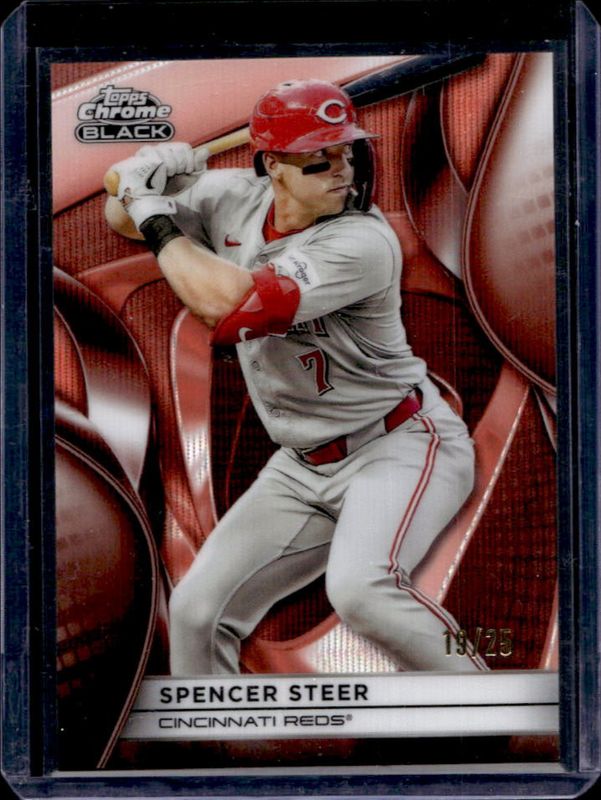 The Spencer Steer 2025 Topps Chrome Black #59 Orange Refractor /25 card is 1 of 17 Spencer Steer's card variations in the 2025 Topps Chrome Black set being tracked by Sports Card Investor, including Base, Refractor /199, Blue Lava Refractor /150, Blue Refractor /150, and Green Refractor /99.