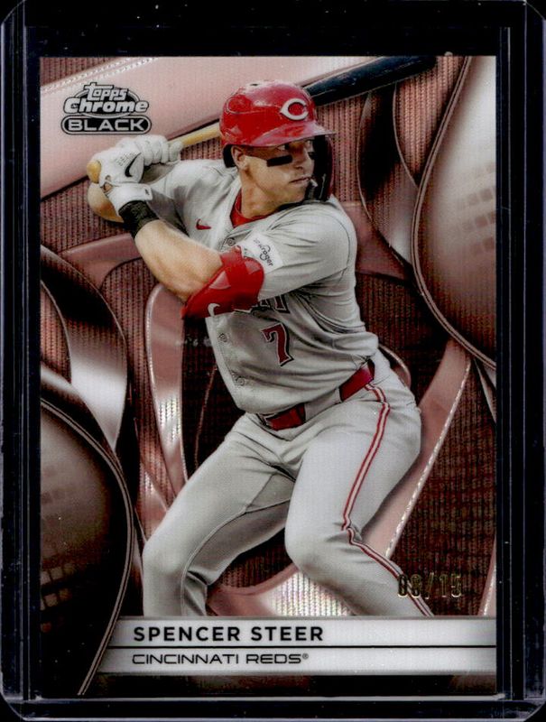 The Spencer Steer 2025 Topps Chrome Black #59 Rose Gold Wave Refractor /15 card is 1 of 17 Spencer Steer's card variations in the 2025 Topps Chrome Black set being tracked by Sports Card Investor, including Base, Refractor /199, Blue Lava Refractor /150, Blue Refractor /150, and Green Refractor /99.