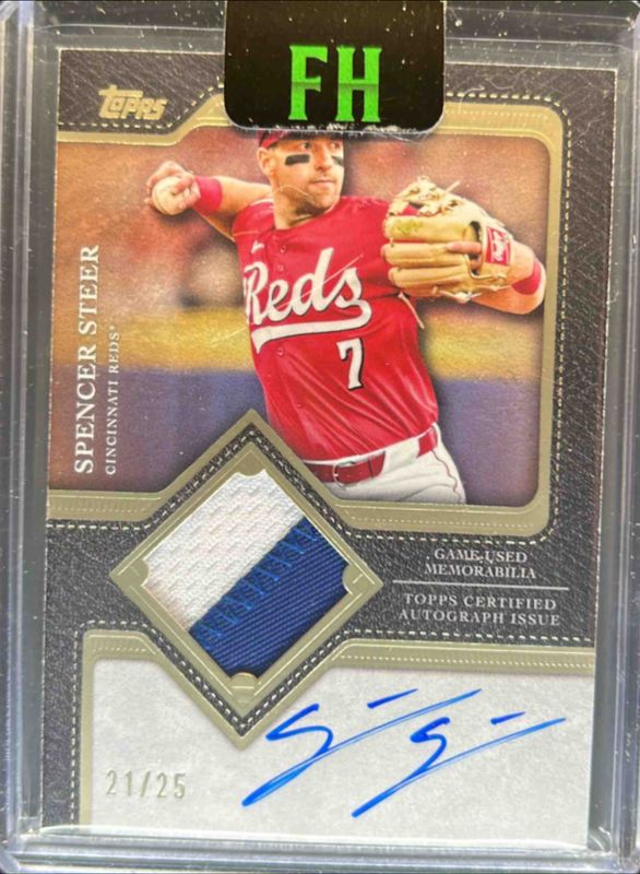The Spencer Steer 2025 Topps #TFAP-STE Flagship Autographs Patch - Bronze card is 1 of 92 Spencer Steer's card variations in the 2025 Topps set being tracked by Sports Card Investor, including Base, Aqua Holo Foil, Diamante Foil, Holo Foil, and Pink Diamante Foil.