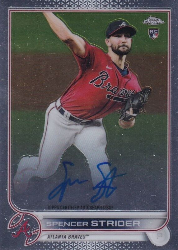 Spencer Strider's Baseball cards are available in at least 42 sets. Spencer Strider's biggest 7-day price movers are 2022 Topps Fire #FA-SS Fire Autographs, 2022 Topps Chrome #RA-SS Rookie Auto, and 2020 Bowman Draft #CDA-SS Chrome DP Auto - Sparkle Refractor /71 (1st).