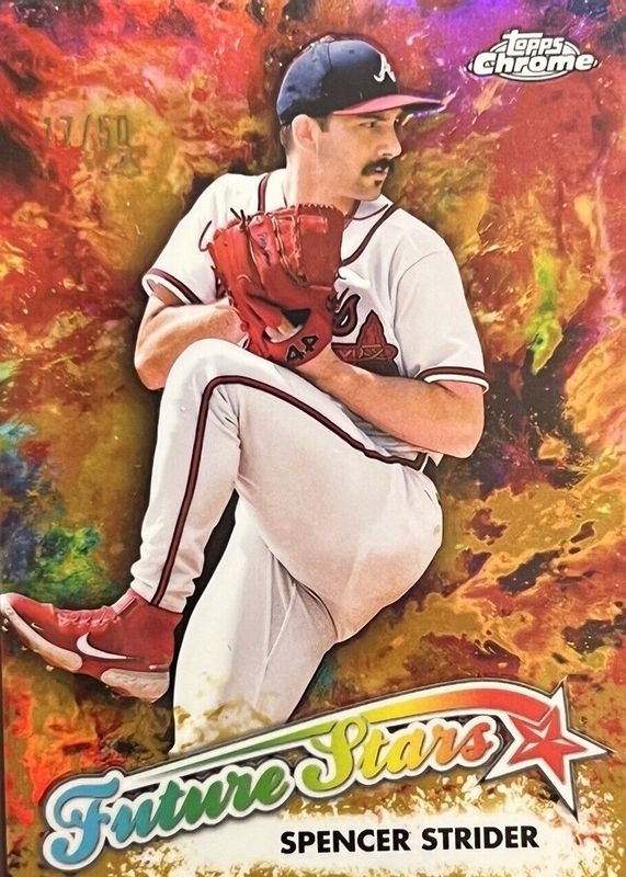 The Spencer Strider 2023 Topps Chrome #FS-15 Future Stars - Gold Refractor /50 card in Raw condition has not changed in price in the last 30 days and was last sold for $8.50 .