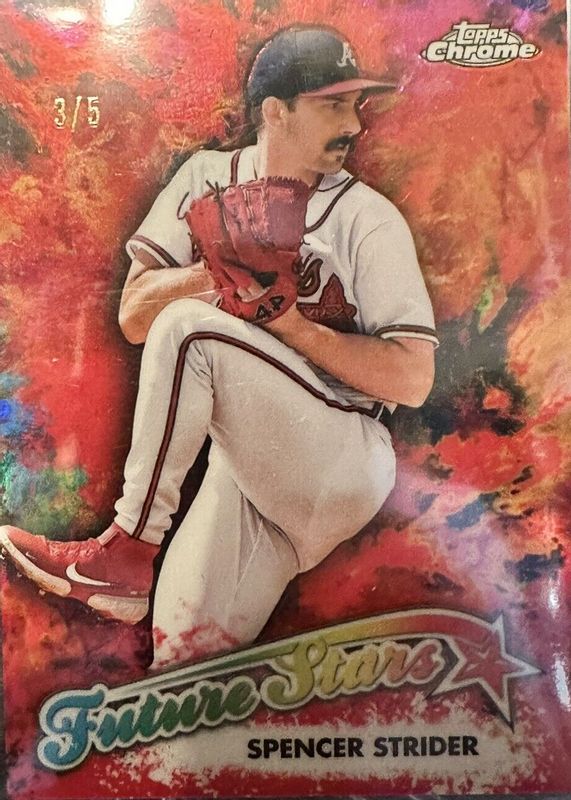The Spencer Strider 2023 Topps Chrome #FS-15 Future Stars - Red Refractor /5 card in Raw condition has not changed in price in the last 30 days and was last sold for $156.00 .