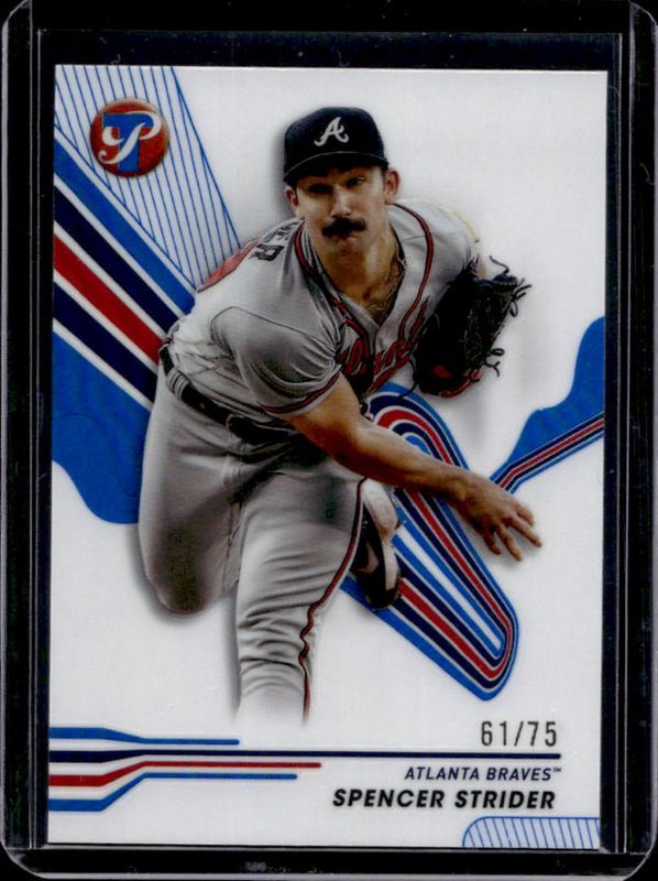 The Spencer Strider 2024 Topps Pristine #76 Blue Refractor /75 card is 1 of 27 Spencer Strider's card variations in the 2024 Topps Pristine set being tracked by Sports Card Investor, including Base, Pristine Refractor, Refractor, Green Refractor /150, and Pristine Purple Refractor /99.