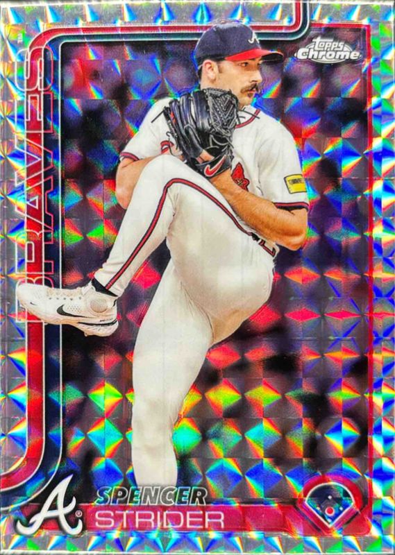 The Spencer Strider 2025 Topps Chrome #46 Geometric Refractor card is 1 of 52 Spencer Strider's card variations in the 2025 Topps Chrome set being tracked by Sports Card Investor, including Base, Lightboard Logo Variation, Negative Refractor, Prism Refractor, and RayWave Refractor.