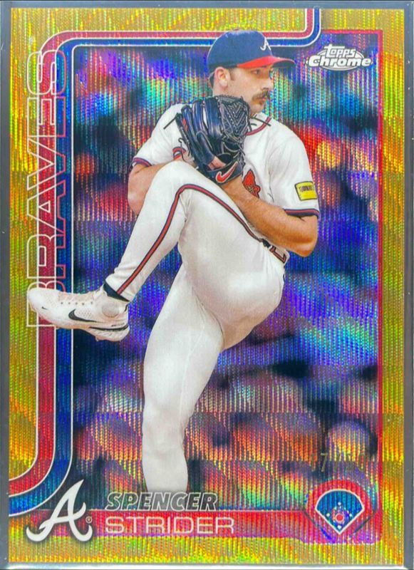 The Spencer Strider 2025 Topps Chrome #46 Gold Wave Refractor /50 card is 1 of 52 Spencer Strider's card variations in the 2025 Topps Chrome set being tracked by Sports Card Investor, including Base, Geometric Refractor, Lightboard Logo Variation, Negative Refractor, and Prism Refractor.