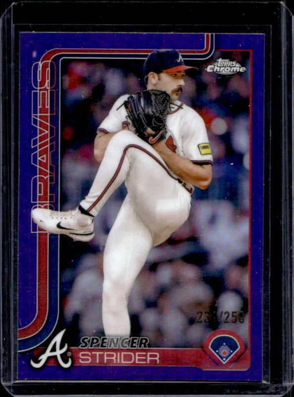 The Spencer Strider 2025 Topps Chrome #46 Purple Refractor /250 card is 1 of 52 Spencer Strider's card variations in the 2025 Topps Chrome set being tracked by Sports Card Investor, including Base, Geometric Refractor, Lightboard Logo Variation, Negative Refractor, and Prism Refractor.