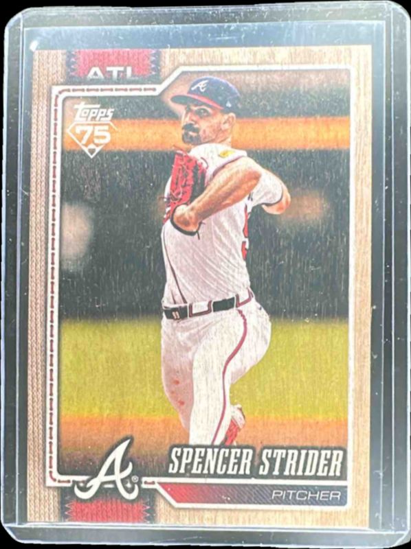 The Spencer Strider 2026 Topps #79 Wood /25 card is 1 of 77 Spencer Strider's card variations in the 2026 Topps set being tracked by Sports Card Investor, including Base, Aqua Holo Foil, Aqua Rainbow Foil, Diamante Foil, and Holo Foil.