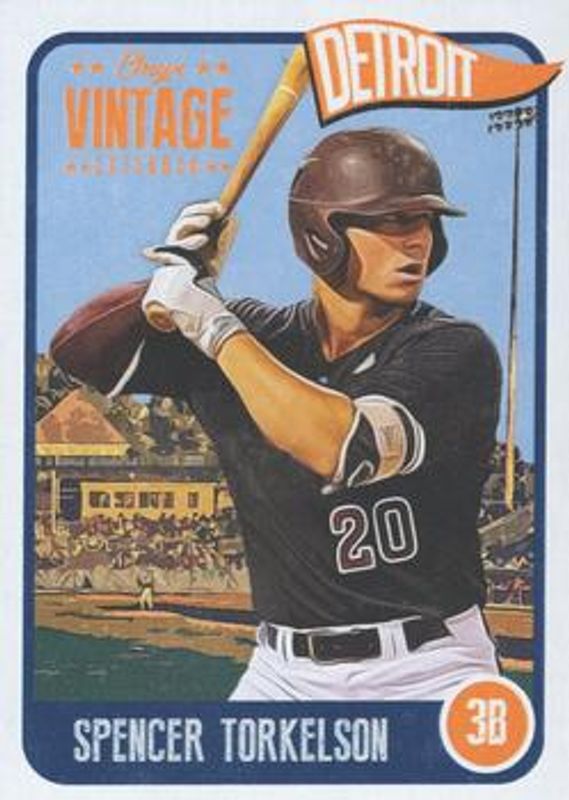 The Spencer Torkelson 2020 Onyx Vintage Extended #VEST Base card is 1 of 5 Spencer Torkelson's card variations in the 2020 Onyx Vintage Extended set being tracked by Sports Card Investor, including Autographs - Blue, Autographs - Green, Autographs - Red, and Autographs - Black /5.