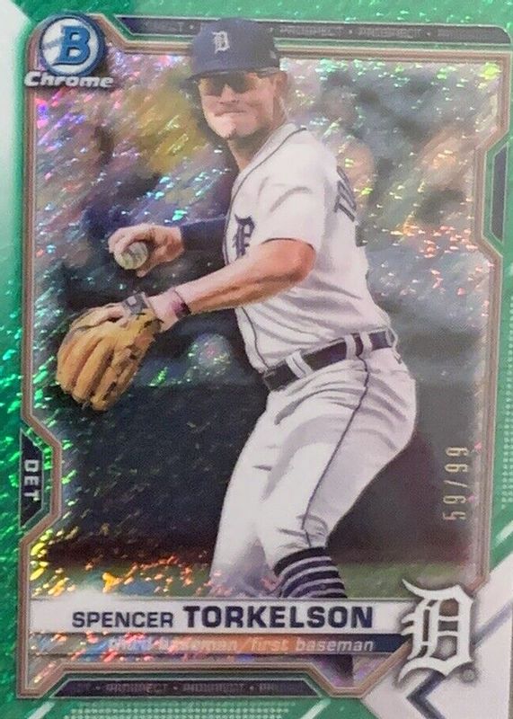 The Spencer Torkelson 2021 Bowman Chrome #BCP-187 Prospects - Green Shimmer Refractor /99 card in Raw condition has not changed in price in the last 30 days and was last sold for $12.99 .