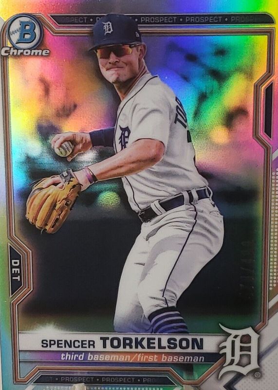 This card is 1 of 22 Spencer Torkelson's card variations in the 2021 Bowman Chrome set being tracked by Sports Card Investor, including Prospects, Prospects - Black & White Mini-Diamond Refractor, Prospects - Shimmer Refractor, Prospects - Speckle Refractor /299, and Prospects - Purple Refractor /250.