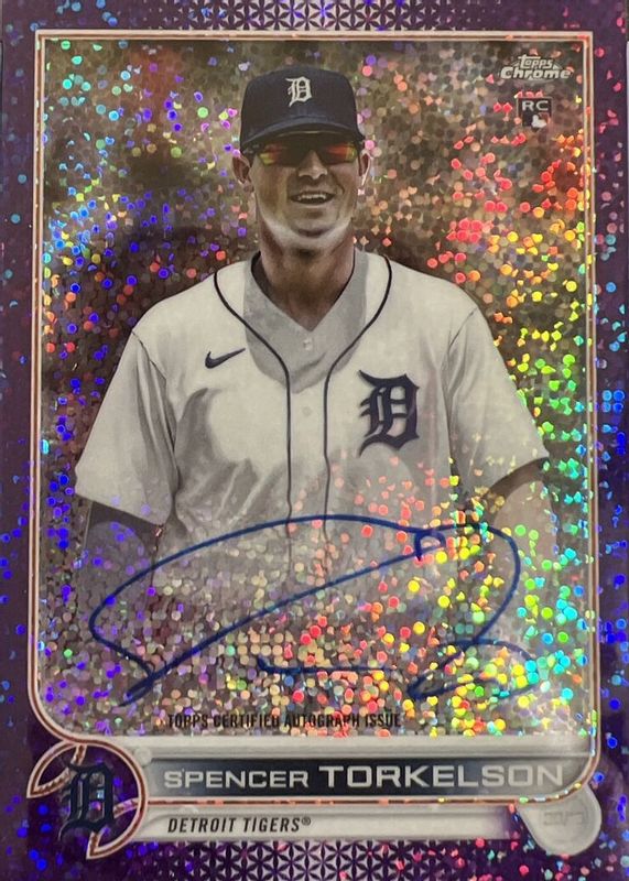 This card is 1 of 16 Spencer Torkelson's card variations in the 2022 Topps Chrome set being tracked by Sports Card Investor, including Extended Short Print, Rookie Auto - Refractor /499, Rookie Auto - Purple Speckle Refractor /299, Rookie Auto - Purple Refractor /250, and Rookie Auto - Aqua Wave Refractor /199.