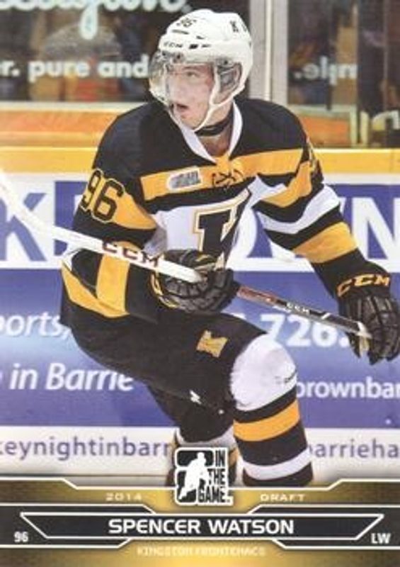 The Spencer Watson 2014 In The Game Draft Prospects #34 Base card is 1 of 12 Spencer Watson's card variations in the 2014 In The Game Draft Prospects set being tracked by Sports Card Investor, including Bronze /25, Silver /10, Gold /1, Printing Plates Black /1, and Printing Plates Cyan /1.