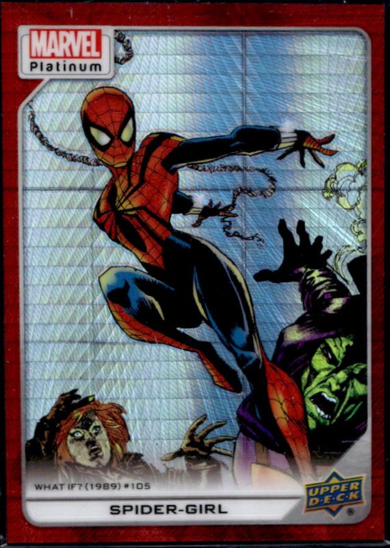 The Spider-Girl 2023 Upper Deck Marvel Platinum #174 Red Prism /199 card is 1 of 30 Spider-Girl's card variations in the 2023 Upper Deck Marvel Platinum set being tracked by Sports Card Investor, including Base, Black Rainbow, Blue Rainbow, Blue Surge, and Purple Rainbow.