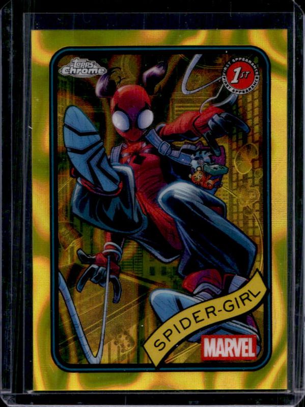 The Spider-Girl 2025 Topps Chrome #143 Yellow Lava Refractor card is 1 of 29 Spider-Girl's card variations in the 2025 Topps Chrome set being tracked by Sports Card Investor, including Base, Refractor, Spider Web Refractor /399, Blue Refractor /299, and Blue & Green Shimmer Refractor /199.