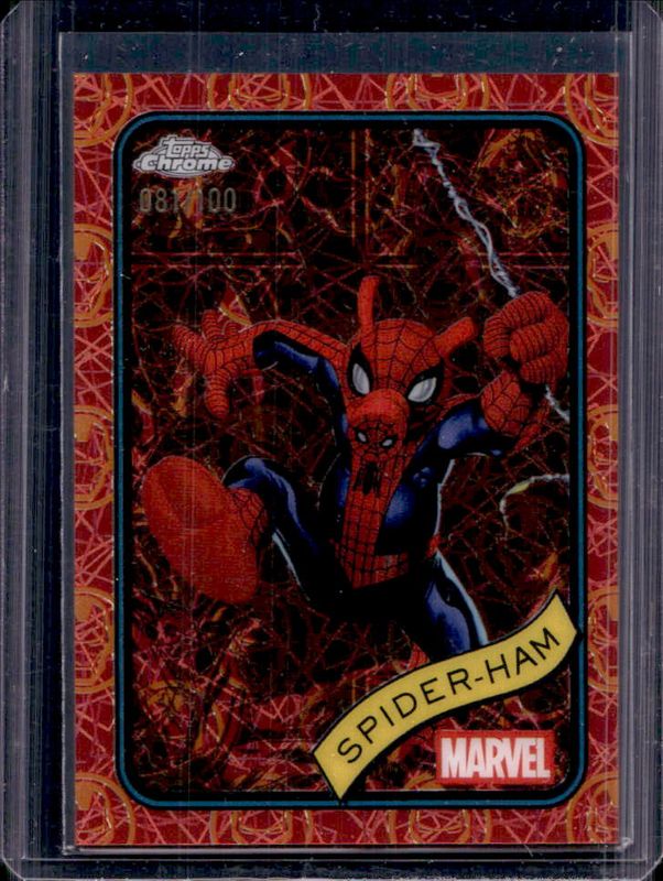 The Spider-Ham 2025 Topps Chrome #142 Iron Man Red & Gold Lazer Refractor /100 card is 1 of 23 Spider-Ham's card variations in the 2025 Topps Chrome set being tracked by Sports Card Investor, including Base, Refractor, Yellow Lava Refractor, Spider Web Refractor /399, and Blue Refractor /299.