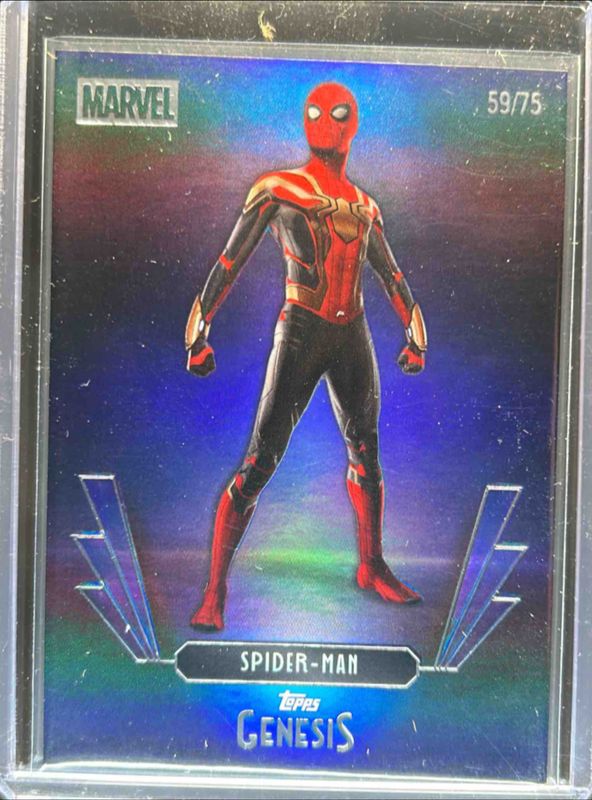 The Spider-Man 2025 Topps Disney Genesis #100 Blue Foil /75 card is 1 of 7 Spider-Man's card variations in the 2025 Topps Disney Genesis set being tracked by Sports Card Investor, including Base /99, Gold Foil /50, Orange Foil /25, Black Shimmer /10, and Red Shimmer /5.