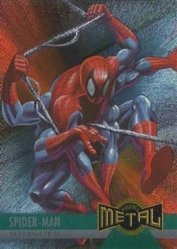 The Spider-Man 1995 Marvel Metal #134 Base card is 1 of 7 Spider-Man's card variations in the 1995 Marvel Metal set being tracked by Sports Card Investor, including #78 Base, #134 Silver Flasher, #78 Silver Flasher, #12 Gold Blasters, and #12 Metal Blasters.