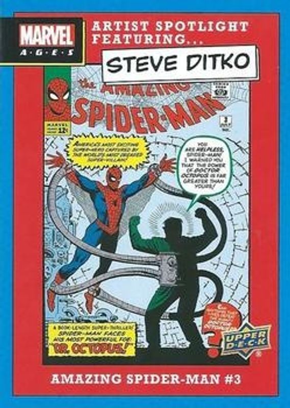 The Spider-Man 2020 Upper Deck Marvel Ages #ASF-3 Artist Spotlight featuring Steve Ditko card is 1 of 26 Spider-Man's card variations in the 2020 Upper Deck Marvel Ages set being tracked by Sports Card Investor, including #282 Base, #282 High Series Foil Board, #3D-3 3 D Lenticular Puzzles, #3D-4 3 D Lenticular Puzzles, and #3D-1 3 D Lenticular Puzzles.